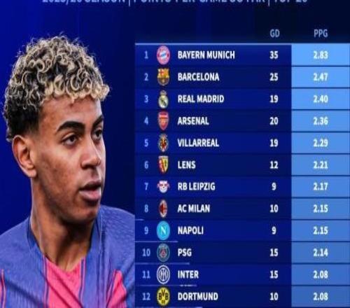 北京时间12月6日,德转统计出了本赛季至今欧洲五大联赛场均积分排名前20的球队,拜仁慕尼黑2.83分高居第一,巴塞...