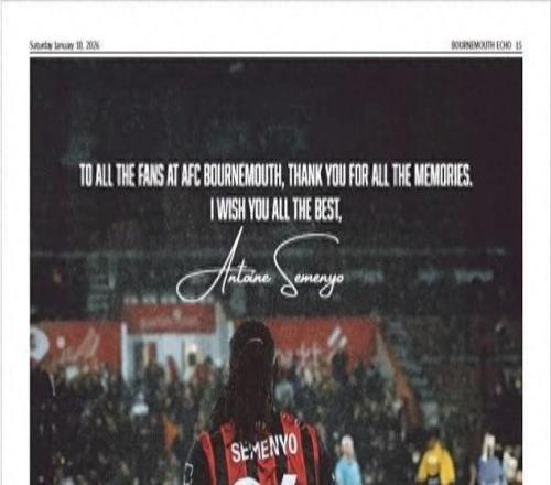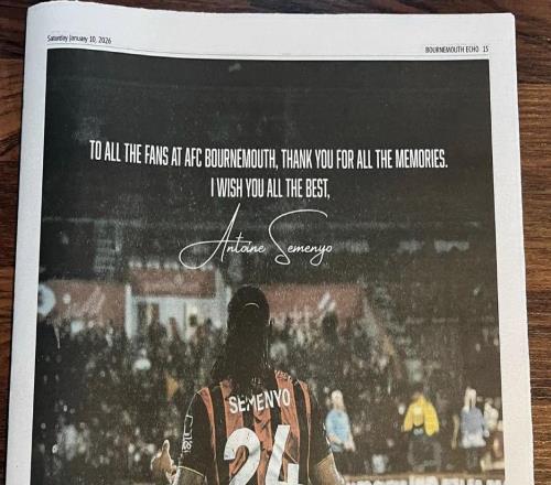 塞梅尼奥6250万英镑转会曼城,买下整版报纸致谢伯恩茅斯球迷
