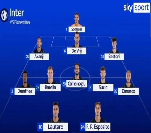 索默;阿坎吉、德弗赖、巴斯托尼;邓弗里斯、巴雷拉、恰尔汗奥卢、苏契奇、迪马尔科;劳塔罗、皮奥-埃斯波西托