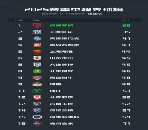 本赛季中超丢球榜:成都蓉城28球最少,梅州客家71球最多