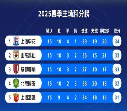 2025赛季中超主场成绩排名:申花34分居首,海港31分排名第五