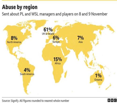 在11月8日至9日的周末期间,英超和女子超级联赛(WSL)的教练与球员在社交媒体上收到超过2000条极端辱骂信息,包括死亡威胁、强奸威胁。